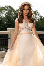 A dress fit for a queen, this incredible design incorporates a fitted skirt and a ballgown-style train overlay that shimmers for the best of both worlds. It features a sheer bodice with stunning applique pattern, capped sleeves and a deep V-neckline, with a low back design. If ever there was a dress that was made to be noticed, it was this beauty.