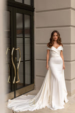 Keep it chic; keep it simple; keep it undeniably sexy! This fit-and-flare wedding dress is ideal for showing off that perfect figure. With a gorgeous off-the-shoulder style that shows just the right amount of cleavage, the silhouette does all the talking. Enjoy a full train and impeccable style.