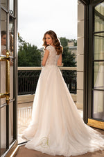 You’ll adore the striking floral detailing of this outstanding wedding gown. Adorning the entire V-neck bodice and delicate capped sleeves, the print graduates down onto the shimmering floor-length skirt. The sheer high back is ornamented with buttons and the flowing skirt falls to the most perfect train that pools around the feet.