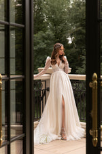 while long delicate sleeves keep it classy. Wrapped around the waist for an enhanced silhouette, this floor-length gown features buttons down the front and a backless design that is sure to raise a few admiring glances.